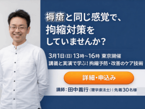 田中義行先生の「講義と実演で学ぶ!拘縮予防・改善のためのケア技術」を会場開催いたします。